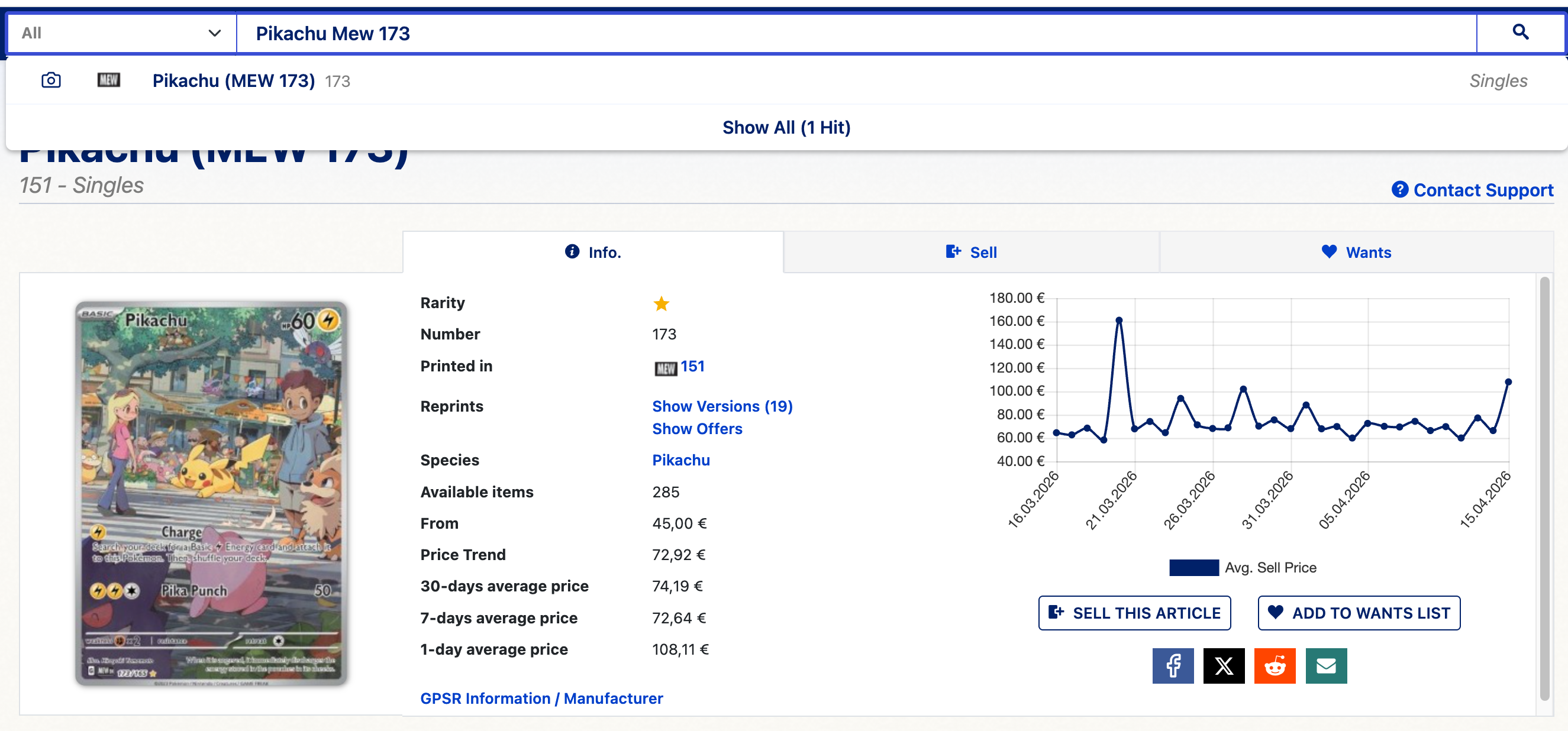 Als je gericht iets zoekt, kun je het beste het nummer van de kaart ook invullen, die kun je linksonder op de kaart vinden. Bijvoorbeeld ‘Pikachu Mew 173’ [kaartnaam + serie + nummer] in dit geval krijg je de meest accurate opties.