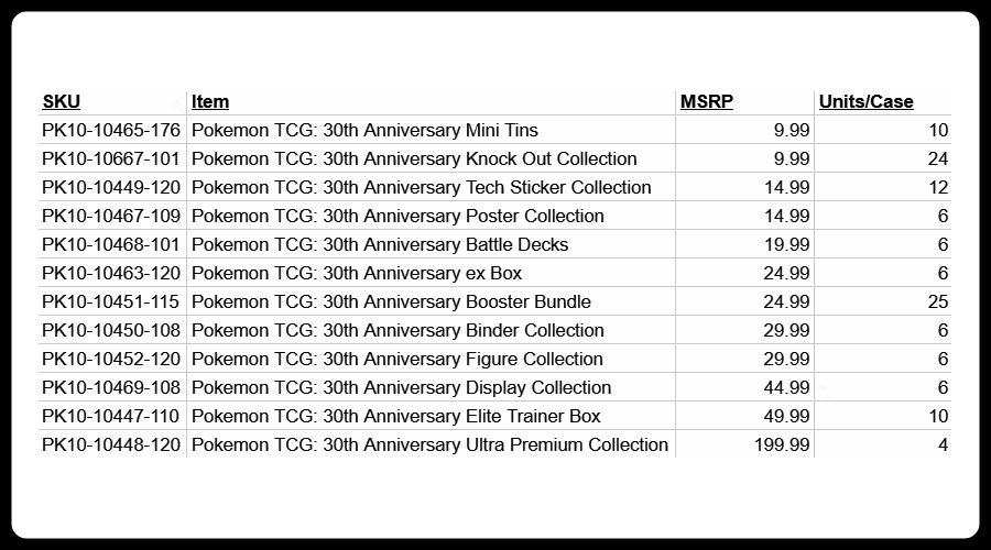 Er is een lijst opgedoken met mogelijke producten voor de Pokémon TCG 30th Anniversary. De line-up lijkt breed en volgt het bekende patroon van eerdere jubileumsets.