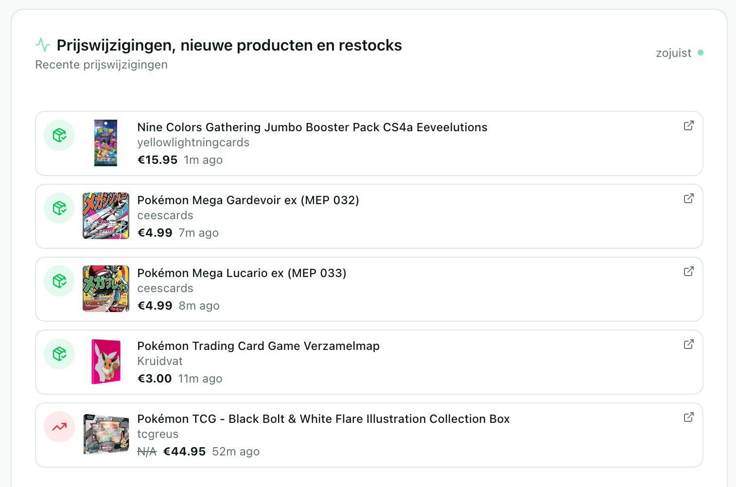Zie direct wanneer prijzen dalen, producten verschijnen of weer op voorraad komen. Geen vertraging, geen ruis en alles in één overzichtelijk dashboard.